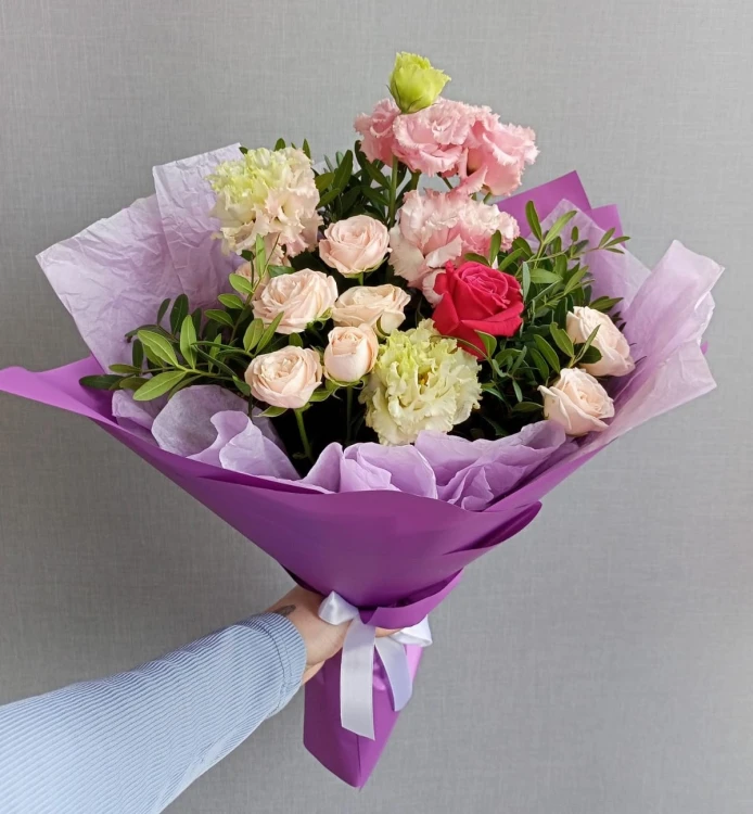 Этот нежный букет "Наслаждение" - воплощение гармонии и изящества природы. Он вобрал в себя прекрасное сочетание микса кустовых и одноголовых роз, разбавленных красивыми эустомами, которые придают композиции неповторимую красоту. Зелень, украшающая букет, добавляет свежесть и живость. Этот букет идеально подойдет для особых случаев, подарив прекрасные моменты и запечатлев красоту природы в единственном экземпляре.